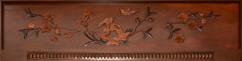 上到二樓後,大片的窗戶映照著明亮的陽光,屋內一片祥和。「和一般房子很不同地是,洋樓的窗戶面積大,牆面成為細條狀,當初,1946年建成的設計就是注重採光和通風。」黃雍熙介紹著房屋的結構,而以不同材質的木頭拼接成圖案的異木鑲嵌,也是早期建築裝飾的一大特色,光潔的原木加上精緻的雕工,顯現優雅的風格。「這個房子是和洋的建築,喧鬧的中式福祿壽喜等祈福意象和西式風格並不搭,因此木工師傅們用巧手將許多傳統的東西轉換成幾何圖案隱藏在屋子裡。」這棟房子極力表達西式建築美學外也滿足了傳統的需求。