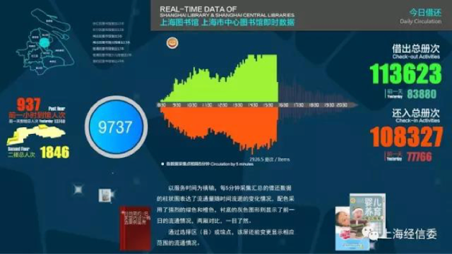 如今在上海圖書館有一面「上海市中心圖書館即時數據展示屏」。藉由這個大型螢幕市圖書館的流通情況、今日到館讀者數、今日借還數據及借還圖書等數據一目了然。