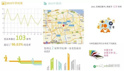 接著一卡通結合數據資源推出「我的悅讀」個人版閱讀帳單服務。該服務不僅展現讀者每年的借閱情況,包括借閱量、借閱偏好、借閱行為等個人化統計和分析,還在動態的頁面中增加了交互內容,讀者可以從中獲得新書推薦、周邊館推薦等個人化體驗。