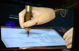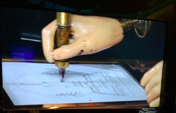 本區展出的物件中,最引人注目的即是這個「自動繪圖員-作家(Automaton Draughtsman-Writer)」,大約在1800年被精心打造出來,該機械能夠存有四幅圖畫以及三首英文與法文詩,透過內部由精密的齒輪所控制,上身則為一個孩童的臉(圖1)與手握著筆進行規律的機械繪製(圖2)。