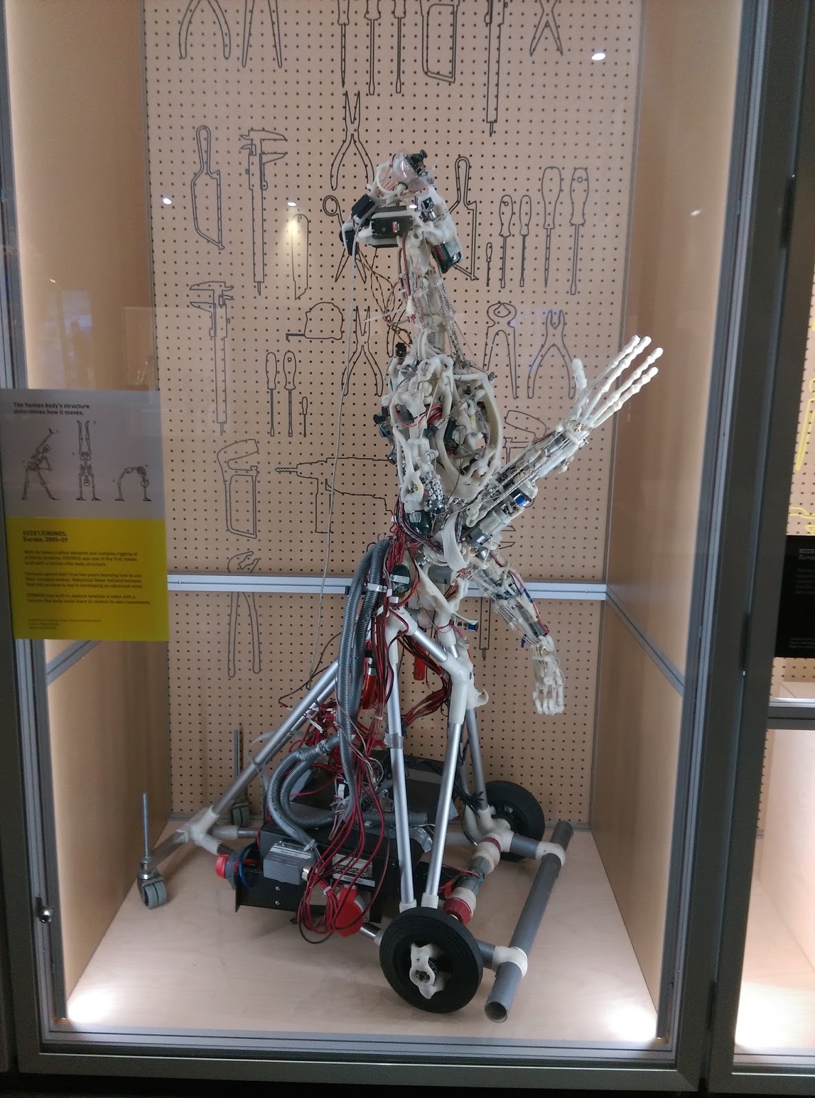 展覽循著時間序以及主題而走,首先是「1570-1800中世紀」,本展區從500年前展開,點出長期以來我們對於自我以及我們在世界位置的認知,是透過宗教信仰表達出來。在16世紀,天主創造天地(God’s creation)的世界觀,包含兩個重要的部分:天堂以及人類的身體。當時教會創造所謂的「自我調節機器(self-regulating machines)」(機器人一詞是二十世紀的產物呢!),用來協助闡述天堂的規律動作(包含報時、展示星星的運動軌跡以及月亮的變化等等)。14世紀初,鐘錶以及更複雜的天文裝置被建造出來,這些機械裝置常被用在表達宗教信仰,因為當時的人類相信藉由模擬上帝的宇宙觀,能夠讓人更近上帝。隨著更多的時鐘被建造出來,中世紀的人們問到:「時鐘也存在我們身體內嗎?」,在當時,把人類的身體比擬為時鐘是一個很強大的想法,因此引導至最早的機器人被創造出來。