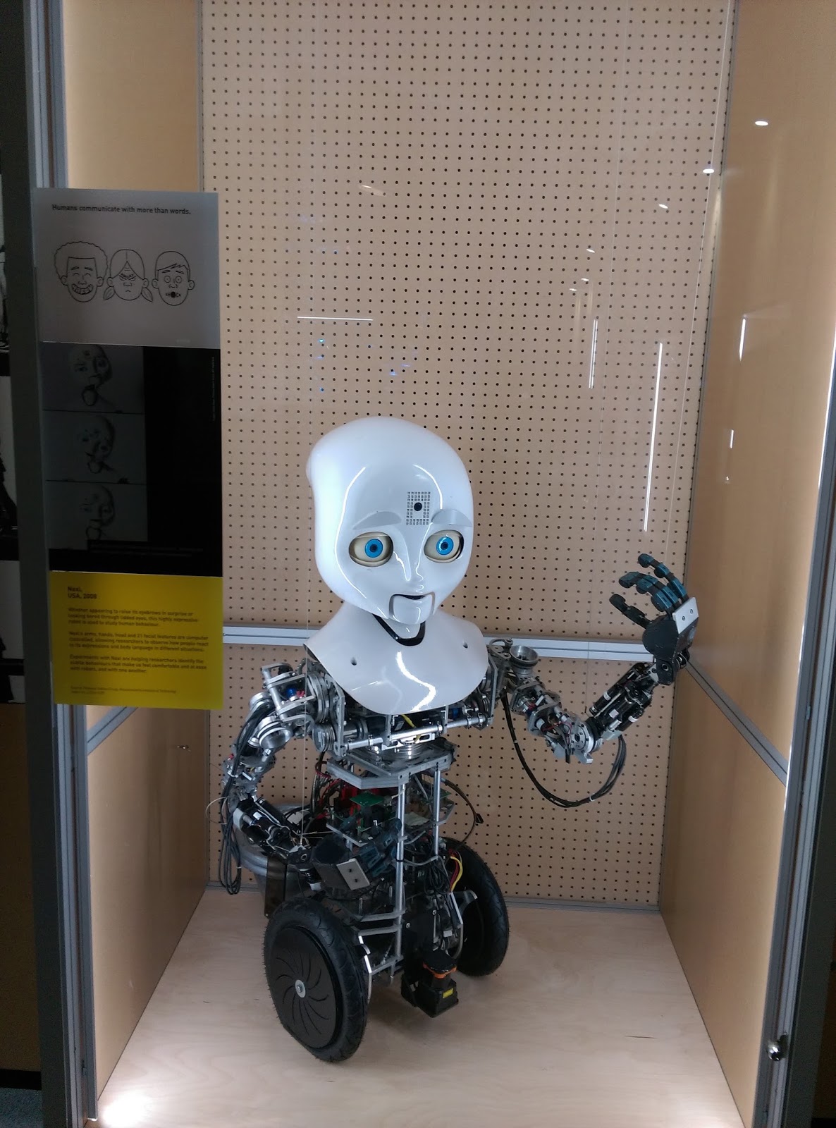 本區猶如機器人博覽會,結合美、日、英、法、義大利、西班牙、瑞士等國精心開發的社會型機器人(圖11-14),並附上影片、圖片與說明,讓觀眾了解生活中人類如何與這些機器人互動。