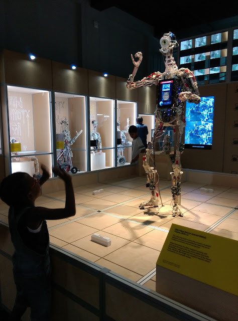 圖7為本區的亮點,機器人(Rob’s Open Source Android)可像人類一樣行動,頭部眼睛的部分有裝置一個攝影機,可以抓到觀眾的臉部圖像,成為觀眾很喜歡的展品之一。 本區運用各種圖示與影片等方式,來介紹人類的創造機器人的各種試驗,包括如何打造四肢關節的動作、如何模擬表情等等(圖8-10)。