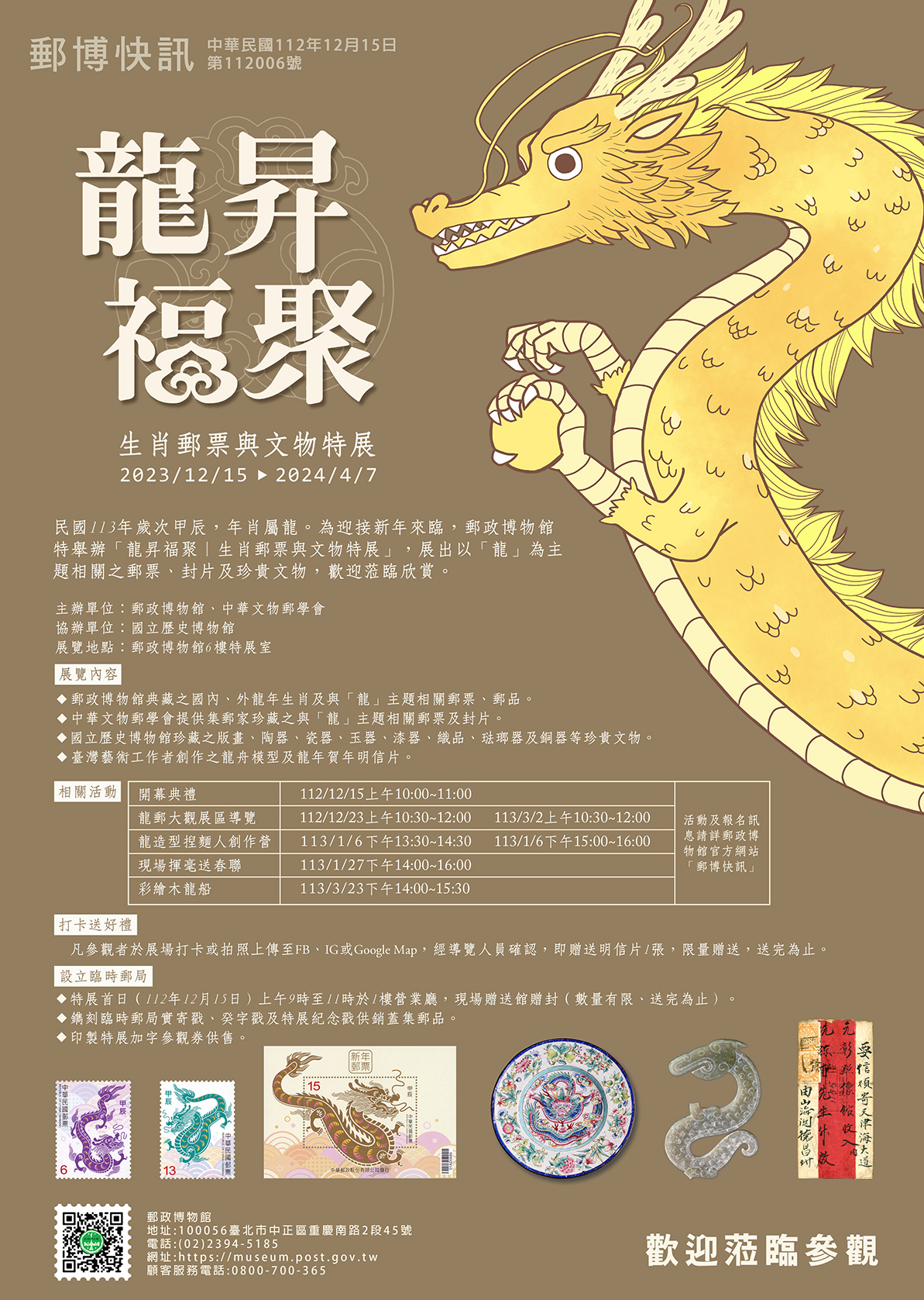 民國113年歲次甲辰,年肖屬龍。為迎接新年來臨,郵政博物館特舉辦「龍昇福聚︱生肖郵票與文物特展」,展出以「龍」為主題相關之郵票、封片及珍貴文物,歡迎蒞臨欣賞。