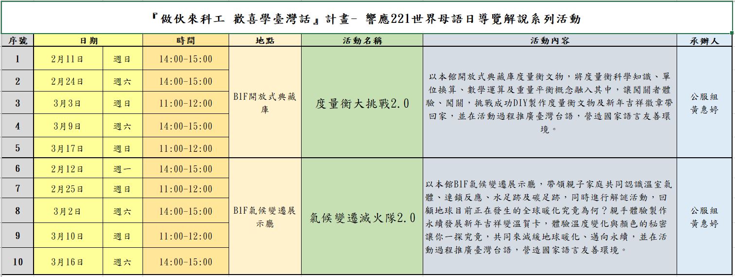 響應221世界母語日,特別推出度量衡文物在典藏2.0及氣候變遷滅火隊2.0,好評活動升級版,活動包含導覽解說、闖關活動、DIY動手做,將獨一無二動手做成品帶回家,特別融入新年元素一同來說新年吉祥話,學習科學知識同時推廣使用臺灣台語。歡迎逐家做伙來科工館,歡喜學臺灣話,報名請上本館推廣教育活動報名系統/做伙來科工 歡喜學臺灣話系列(https://serv.nstm.gov.tw/)。