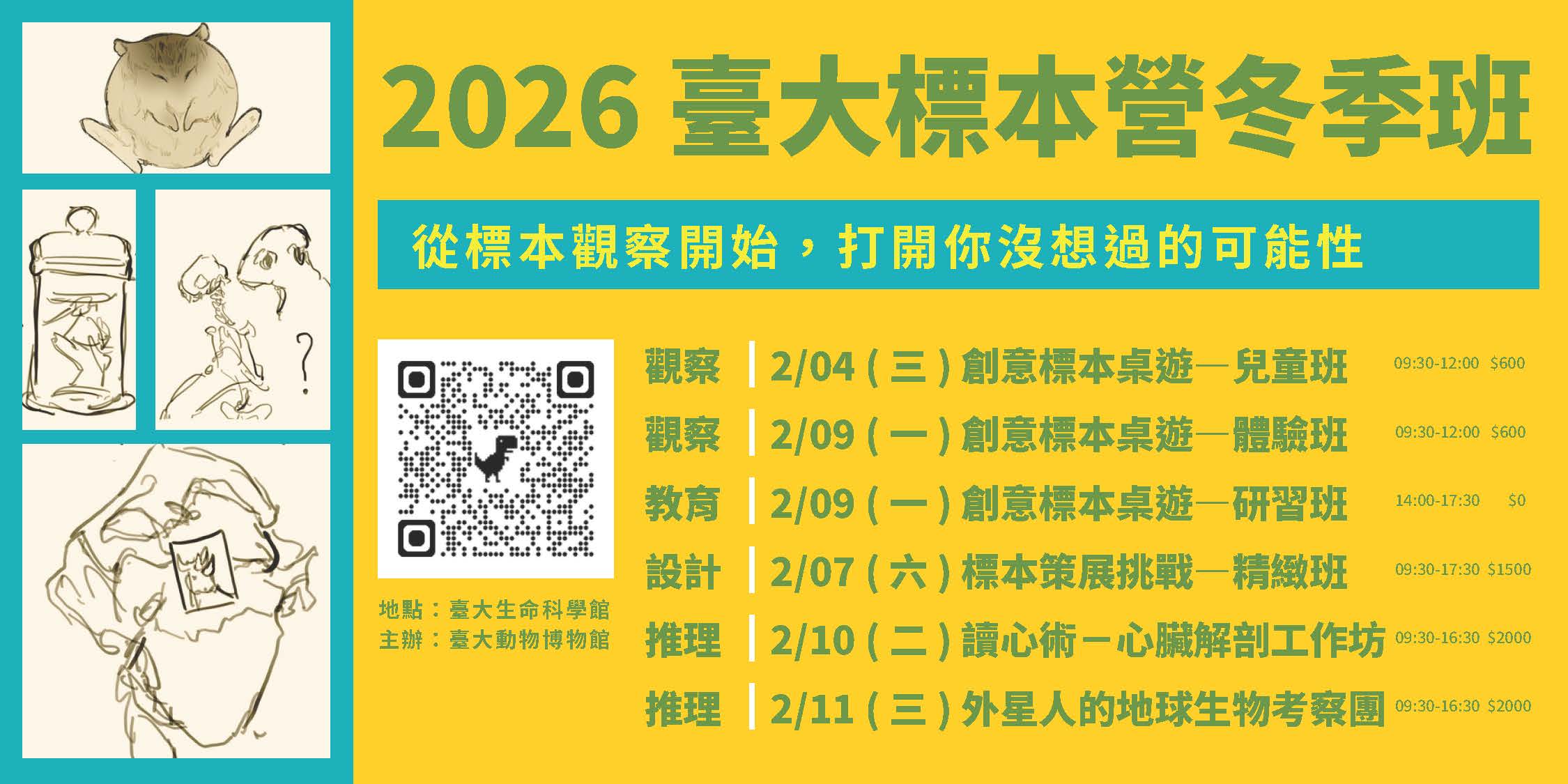 國立臺灣大學動物博物館:自即日起【「2026 臺大標本研習營-冬季班」報名】