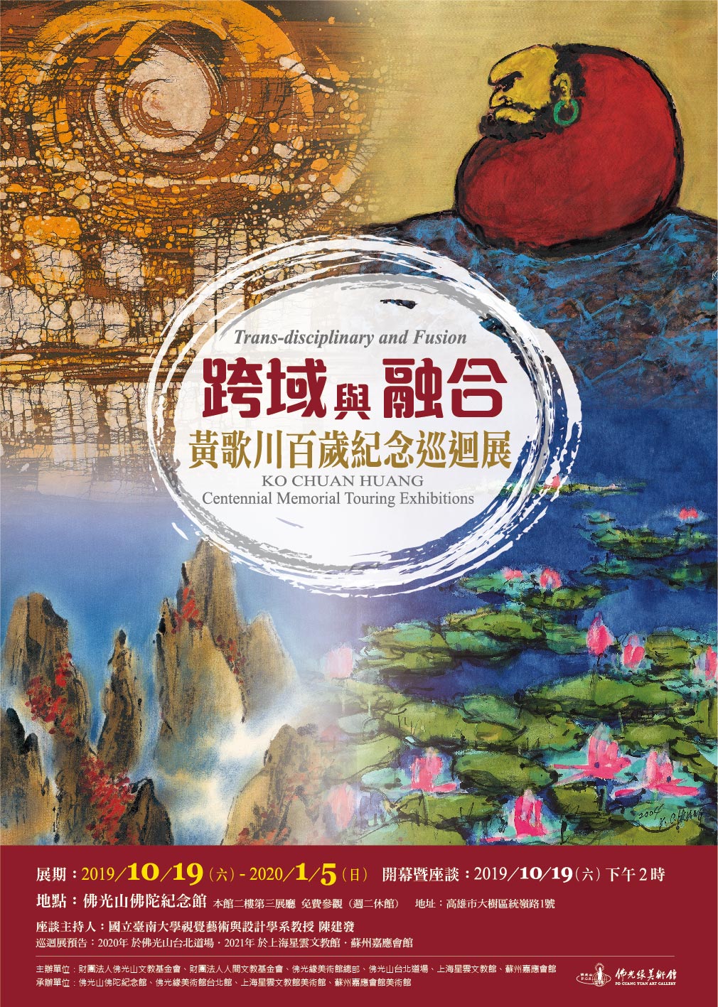 黃歌川(1919〜2010),福建出生,在台定居六十餘年。醉心創作七十寒暑,專精水彩、水墨、蠟染、油畫與複合媒材等,為國內少有東西方媒材兼擅長的全能藝術家。黃歌川七十四歲時,深受星雲大師的影響,開啟佛門因緣,創作達摩禪畫,實現以畫弘法的宏願。