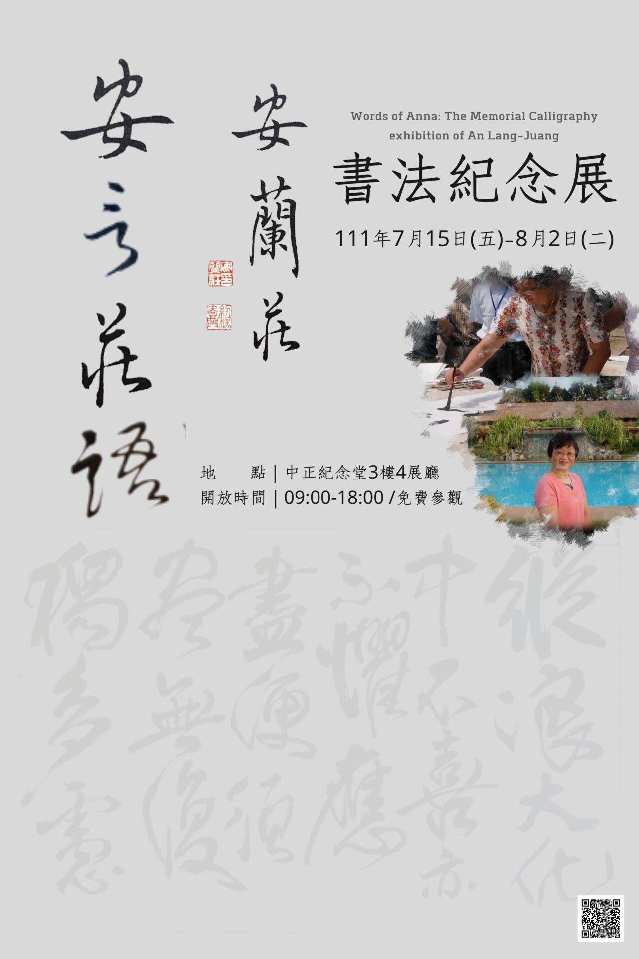 主辦單位表示,安蘭莊寫一輩子書法,字如其人奔放瀟灑,由功力深厚的楷書,造就出行雲流水氣勢磅礡的行草,細看作品可發現前期的作品線條乾淨俐落、行氣流暢、筆法精湛;中期的作品呈現出扭曲姿肆的線條,和跌宕跳躍的節奏,再想像一下安老師中氣十足的上課聲,可發現作品透露出積極旺盛的生命力;後期的作品是專心創作及對生命的了然,在各方面皆成熟時創作出的,不僅有香光莊嚴,展現般若智慧之光,更有豁然的人生觀。安老師嚴厲的教學,讓書法與功德發揚,生後最大的願望是將作品辦遺展,傳承安言莊語,讓大家「心存感恩、正向意念。」