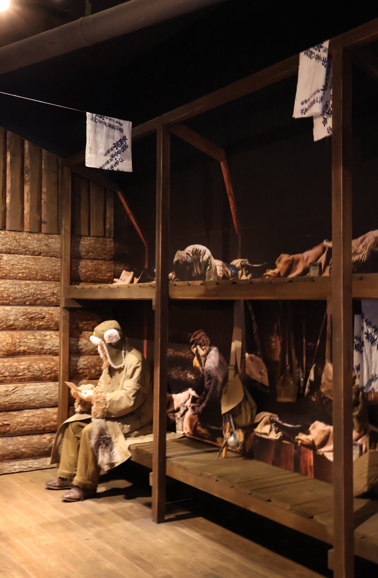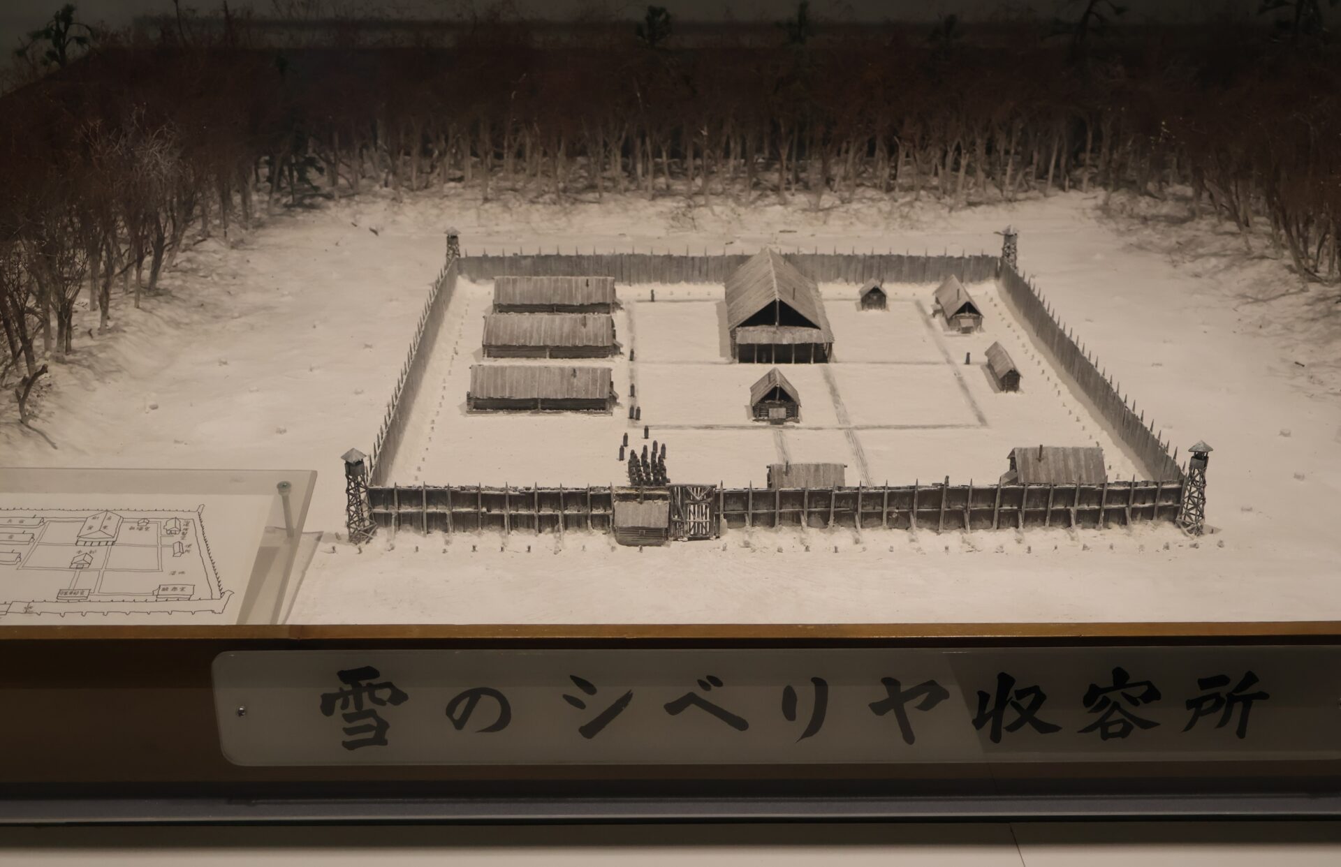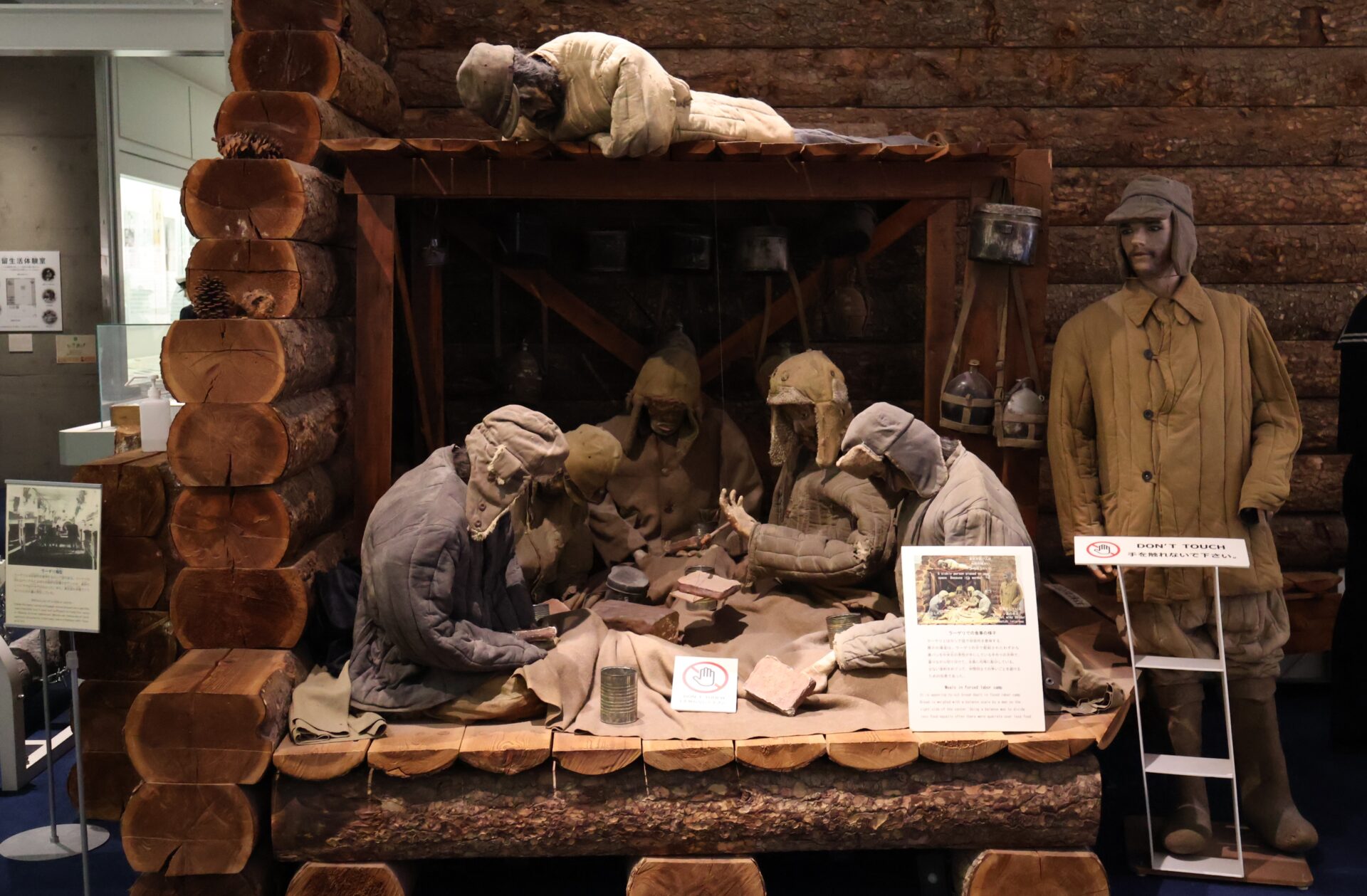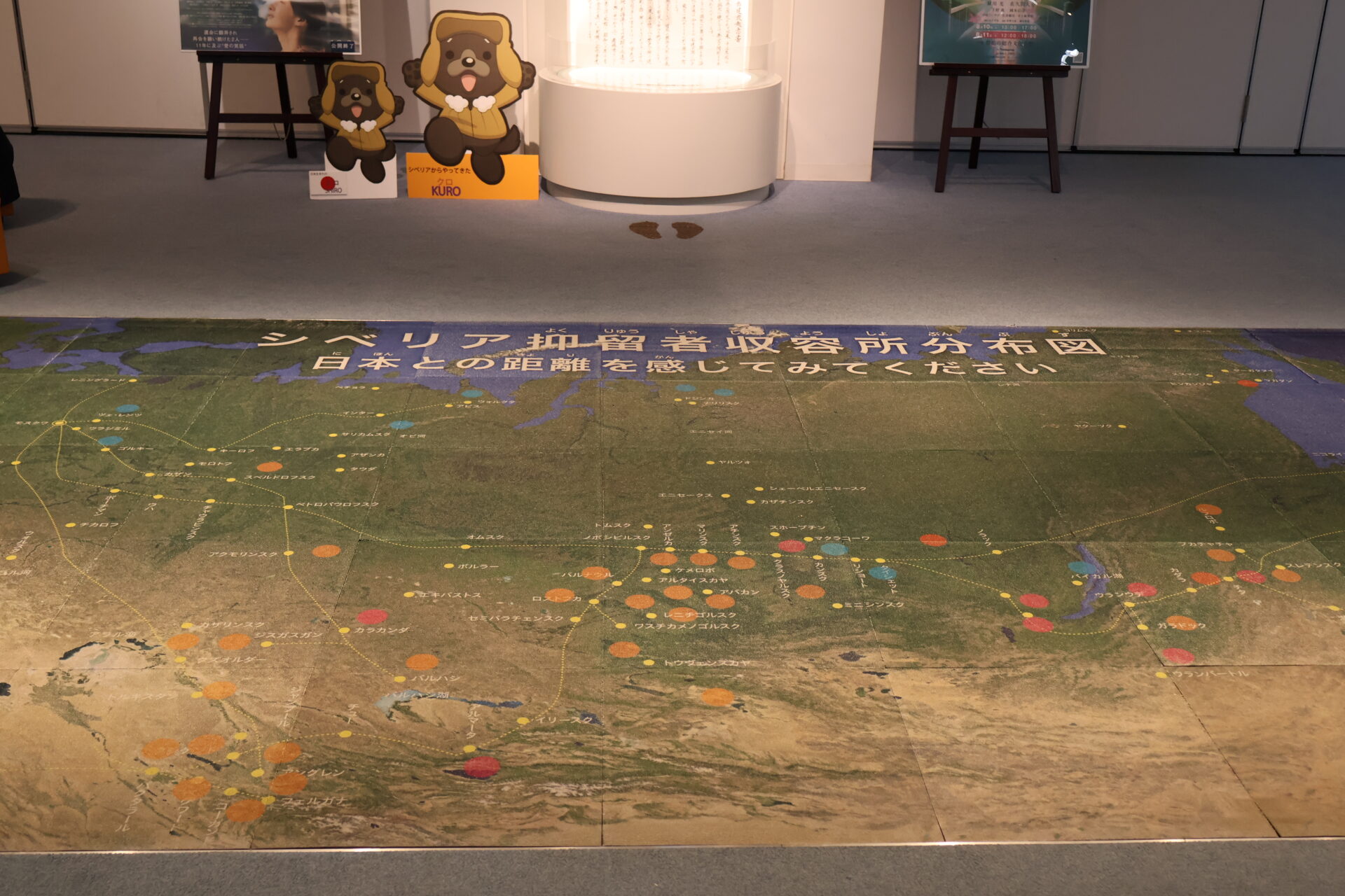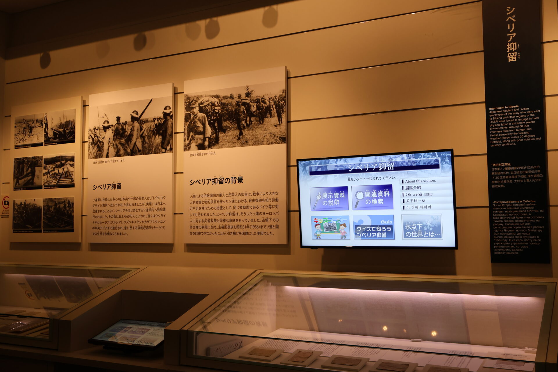 走進紀念館,首先映入觀者眼簾的是鋪設於地面的「西伯利亞拘留營分布圖」,標示著許多引揚者曾經流徙的空間地景。館內亦設有西伯利亞拘留營模型與復原場景,並規劃「拘留體驗空間」。觀者可以親手觸摸展品,嘗試躺上木板床,並在刻意調低的空調溫度與昏暗光線中,體驗被拘留的戰俘所面對的惡劣環境。