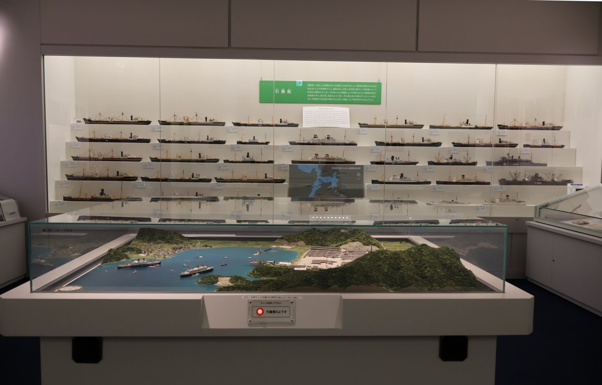 「回國與重逢」展區則聚焦於「引揚」的具體歷程與相關設施,包含當時各類機構的運作情形、引揚設施的配置說明,亦展出舞鶴港與遣返船模型,標示著實際載運人數,不僅具體呈現引揚作業的龐大規模,也聚焦戰後歷史中關於等待、重逢與失落的集體記憶。如展場內迴盪著〈岸壁之母〉【註釋2】的樂曲聲,是館方特別設置的聲音體驗裝置,藉此呈現家屬的漫長等待。當遣返船駛入港口,碼頭邊總聚集盼望親人歸來的婦女,媒體因此稱她們為「岸壁之母」——碼頭上的母親,她們的身影,也成為這段歷史最真摯的見證。