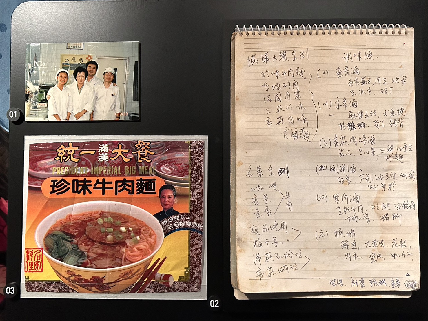 另一處引人駐足的展區,則展出傅培梅「滿漢大餐」泡麵系列的研發手稿與第一代包裝。作為臺灣第一位電視烹飪節目主持人,傅培梅透過料理節目與食譜出版推廣現代化廚藝,連結家庭餐桌與全球華人社群;同時,在戒嚴體制下,她也被賦予推動「中華美食」的象徵角色,折射出飲食如何從家庭廚房延伸,成為具有外交與政治意涵的文化媒介。