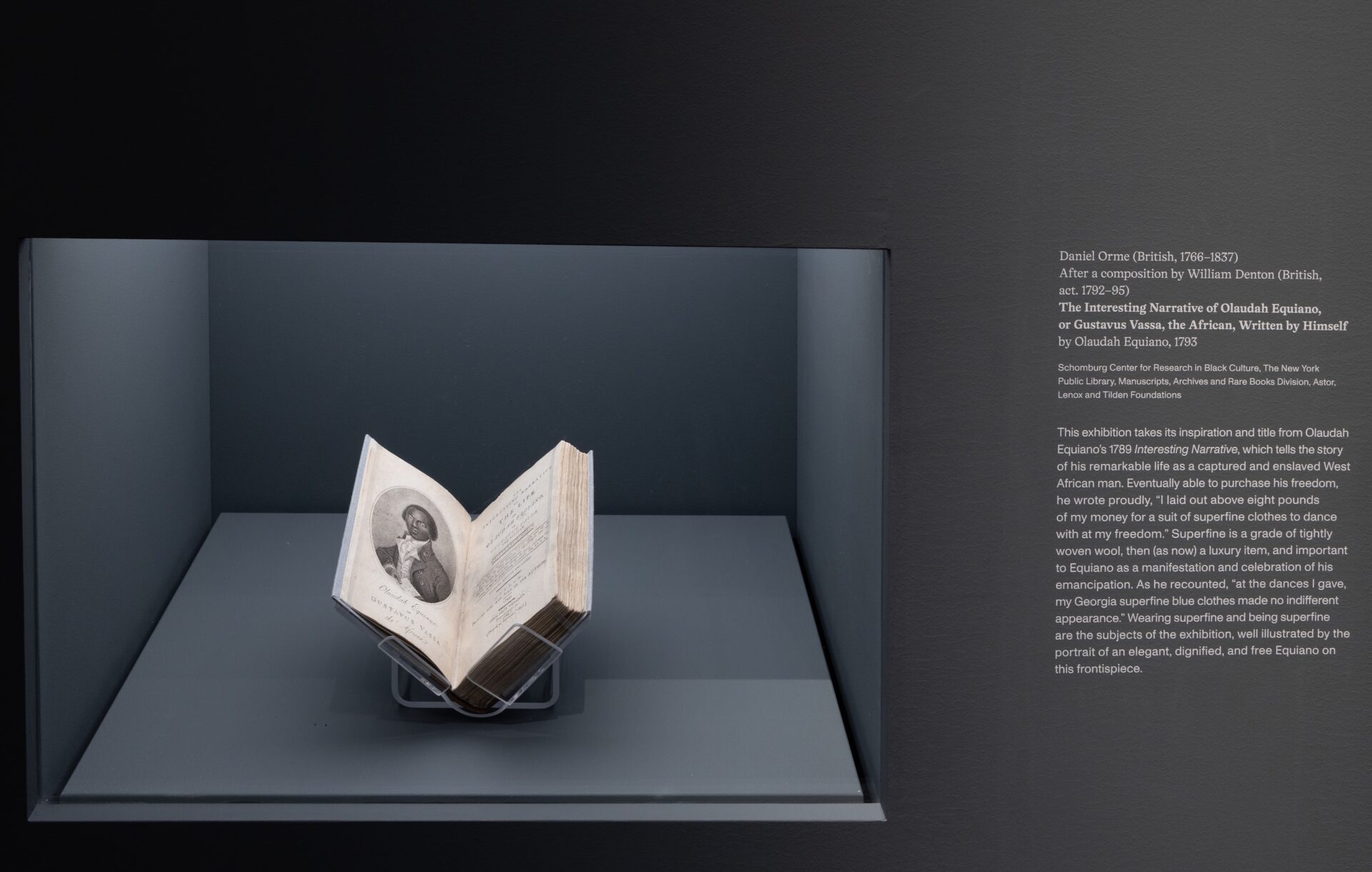 展覽名稱「Superfine」取自18世紀高級羊毛布料的名稱,象徵品味講究與尊嚴,也呼應自由黑人(Free Black)奧拉達‧埃奎亞諾(Olaudah Equiano)自傳中所寫:「我花了八鎊為自己添購一套上等衣服,以自由地跳舞。」這份對服裝的投資,既是美感選擇,更是自我認同的行動表達。