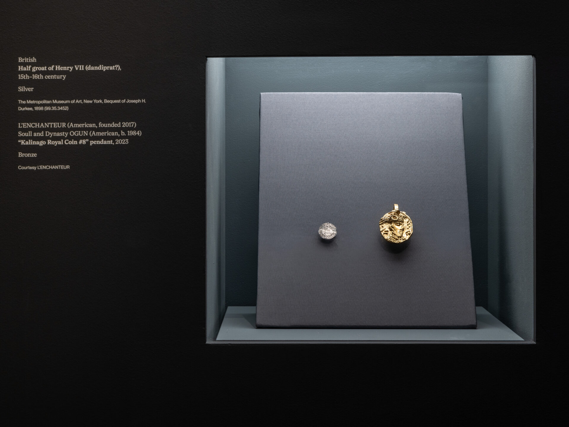 例如,「擁有」展區(Ownership)展示了一枚16世紀英格蘭的半便士銀幣《dandiprat》,被認為可能是「dandy」一詞的來源,並從「小人物、小銀幣」逐漸轉向指涉「誇張打扮、過度修飾的人」。《dandiprat》與L’Enchanteur設計的《卡利納哥皇家硬幣第 8 號》(Kalinago Royal Coin #8)墜飾並置,後者取材自加勒比原住民貨幣並鑄上祖先肖像。這樣的對照展現了當代黑人如何重新詮釋財富符號,運用金銀等材質轉化為自尊與身份的表達。