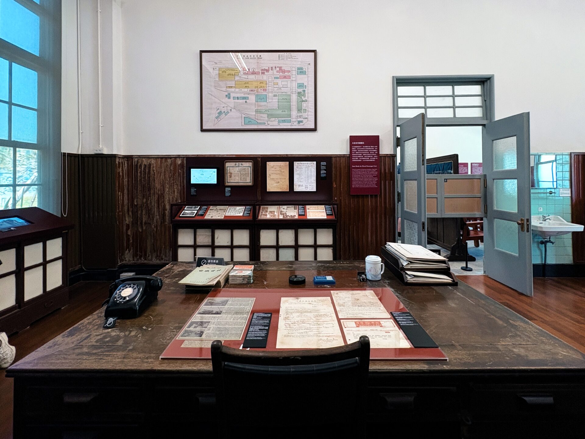 隨著廠區各處逐步修復完成,館方的展示策略首先聚焦於「現地保存」。在「臺北機廠行政中樞—總辦公室」中,館方考證、蒐集並修復舊傢俱與物件,將正、副廠長室、會議室與出納股等空間,營造出昔日使用脈絡,讓觀眾得以從物件與場域的對應中,感受作為廠區行政核心的運作節奏。