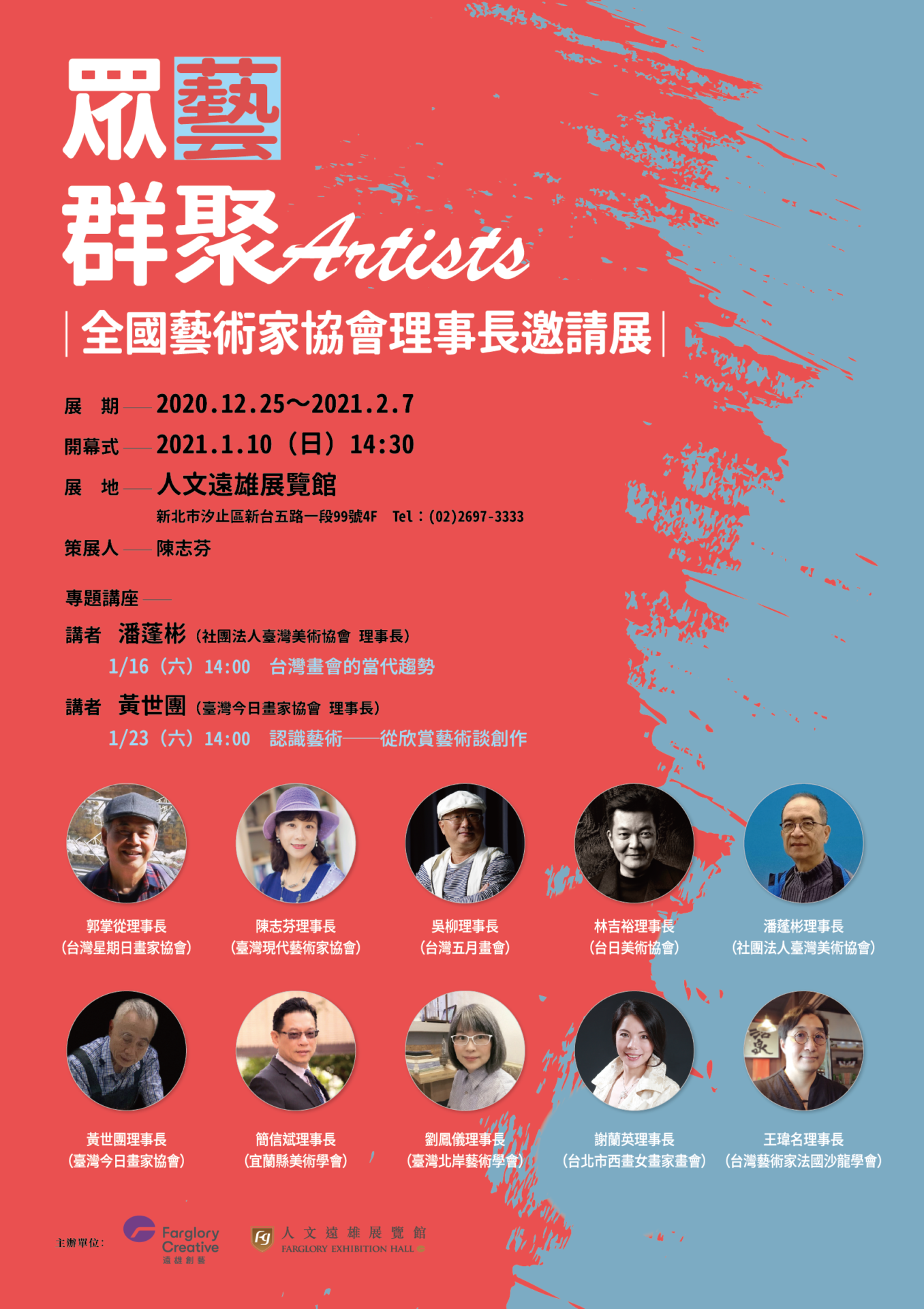 人文遠雄展覽館邀請當今臺灣藝壇十分活絡且資深的十位畫會理事長共同展出。本次展覽中參與的畫會無論是在推動國際交流、跨領域結合甚至地方深耕等,於各方面皆具卓越的貢獻與成就;同時畫會理事長作為藝術家,也各自在不同領域上發光發熱。
