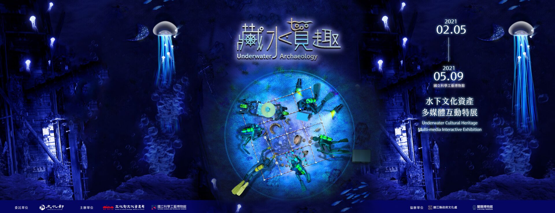 本館與文化部文化資產局合辦於110年2月5日至110年5月9日(每週一、除夕、初一休館)在本館二樓的第一特展廳辦理「藏水覓趣-水下文化資產多媒體互動特展」。展覽透過多媒體科技打造水下沉船情境,以360度環景劇場、VR虛擬實境、AR擴增實境等互動式展示裝置,將臺灣沈船文史以及近幾年來的水下考古工作成果,呈現在國人眼前,現場規劃六大展區,希望在寓教於樂中,讓民眾體驗並認識水下文化資產,一起加入水下文化資產保存工作的行列!