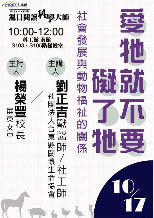 國立科學工藝博物館:10/17【第19屆週日閱讀科學大師講座/愛牠就不要礙了牠—社會發展與動物福祉的關係】