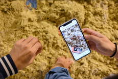 展覽搭配延伸設計的互動體驗區,觸發兒童對海的漫「游」異想與多方探索,本區邀請小朋友撿起海洋廢棄物,幫海底生物建造新家,透過AR擴增實境,化身為海洋的守護者。(圖/桃園市立美術館提供)