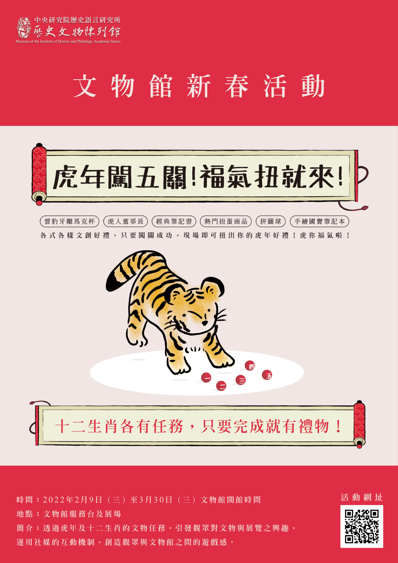 雲豹牙雕馬克杯、虎人董事長、經典筆記書、熱門扭蛋產品、拼圖球、手繪國寶筆記本等文創好禮,只要闖關成功,現場即可扭出你的虎年好禮!虎你福氣啦!