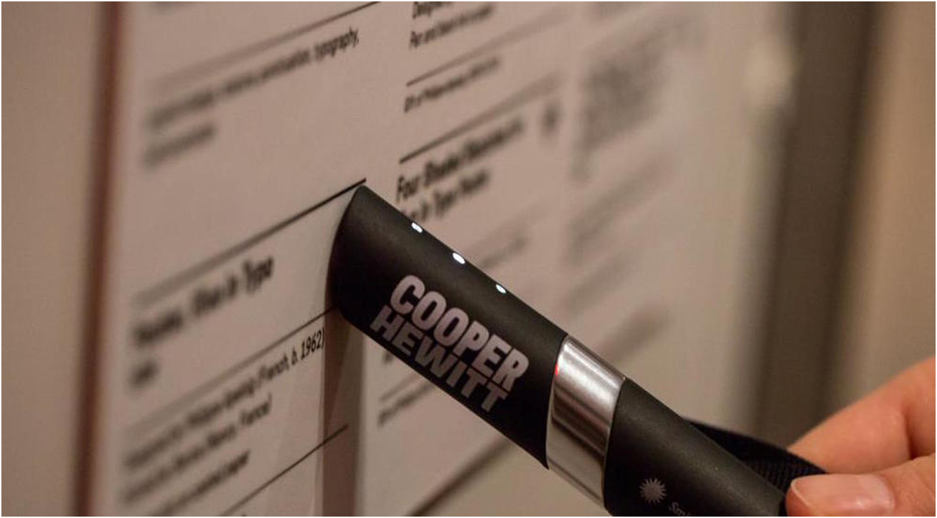 位於紐約的史密桑尼亞設計博物館(Cooper Hewitt, Smithsonian Design Museum),經過長時間整修後重新對外開放,並致力於現代互動藝術的部分,為此他們和不同的合作者共同合作研發了智慧筆(The Cooper Hewitt Pen),讓觀眾可以藉由筆收集和分享展覽的訊息。